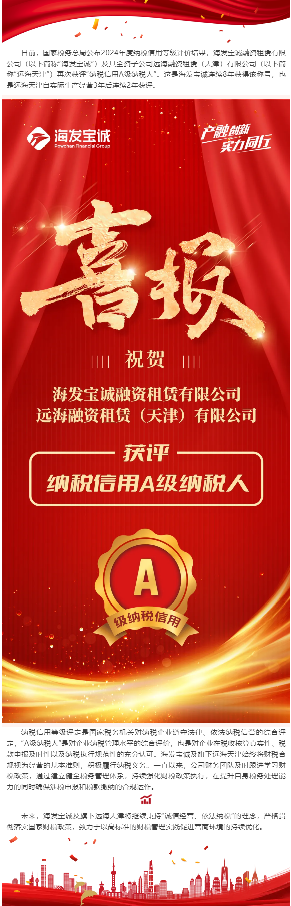 海发宝诚与全资子公司荣获“纳税信用A级纳税人”称号